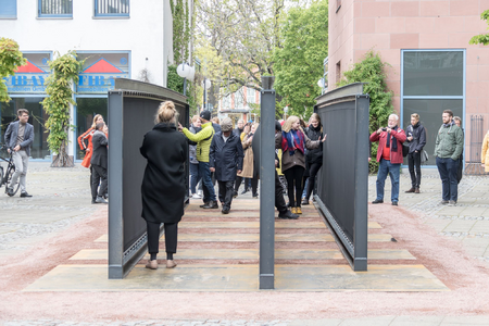 Auf der Wiese vor dem Hauptbahnhof stehen zwei parallel verlaufende Stege, über deren konkave und konvexe Höhen und Tiefen man gehen kann. Diese Station kann man auch als traditionelle Skulptur mit hohem ästhetischen Wert wahrnehmen. Um das Gefühl der Beklemmung geht es inmitten der engen Bebauung des Fürst-Leopold-Carrés. Man läuft zwischen schwarzen Wänden hindurch, die aus elastischem Stoff bestehen und, indem man den beiseite drückt, es einem ermöglichen, sich ein wenig mehr Freiraum zu verschaffen.