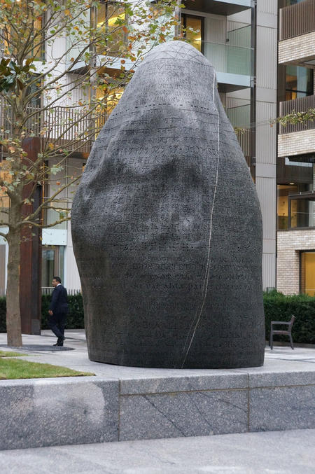 Ursächlich für den kreativen Prozess ist aber nicht das Material, sondern das Bedürfnis etwas Rohes, Intuitives und Allgegenwärtiges zu vermitteln – den Kern dessen, was es bedeutet Mensch zu sein. Kein Beispiel wäre passender dafür, als seine monumentale Skulptur am Fitzroy Place in London: The One and The Many, eine 3 ½ Meter hohe, 25 Tonnen schwere Skulptur aus Granit, überzogen von Symbolen, die auf Schriftsysteme von den frühesten Keilschriften bis hin zu modernen Sprachen verweisen. Die Schriftzeichen erzählen Schöpfungsmythen der ganzen Welt.