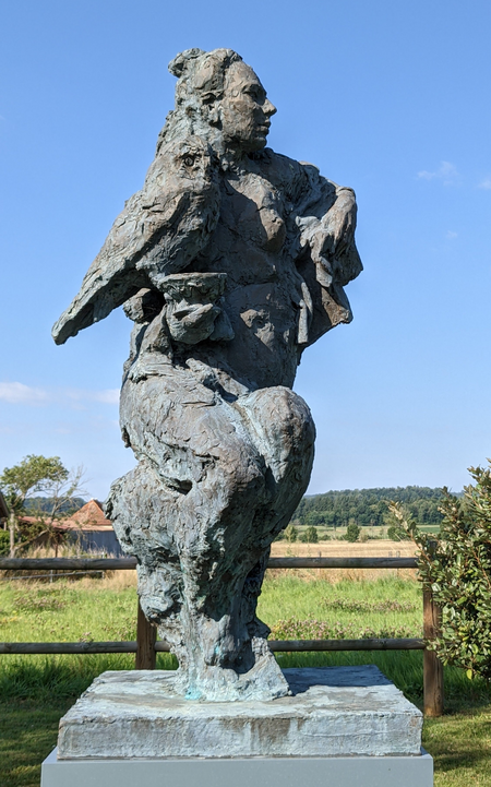Das zweite Denkmal Affinity wurde für alle diejenigen geschaffen, die sich für die Rechte der Tiere einsetzen. Wir sehen eine Frau, die ein Tier auf den Schultern trägt. Sie verkörpert Julie Lasne, eine französische Verhaltensforscherin, die sich weltweit für Tiere einsetzt. Sie wird buchstäblich mit einem Bein im Beton dargestellt, wie ein Don Quijote im Kampf gegen die Windmühlen.