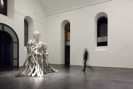 In den Jakobshallen der Galerie Scheffel in Bad Homburg dominieren zwei sehr große filigrane Kopfskulpturen den Ausstellungsraum. Die beiden leicht abstrahierten Köpfe - einer männlich, einer weiblich - blicken sich mit einigem Abstand zueinander gegenseitig an und wirken in dieser Konstellation wie Sphinxe zwischen die sich BetrachterInnen begeben können. Die beiden Köpfe sind aus einem grobmaschigen Edelstahlgitter gefertigt, lassen den Hintergrund durchschimmern und lösen sich, aus einiger Entfernung betrachtet, leicht im Raum auf, verschwimmen und wirken durch ihre offene Gestaltung ephemer und schwerelos. Die weiteren Arbeiten von Plensa sind eher in kleineren Formaten gehalten. Auch sie haben fast alle den Kopf, wenngleich auch manchmal beschnitten oder bruchstückhaft, zum Thema. Diese kleineren Bronzeköpfe sind plastisch ausgearbeitet und in ihrem Geschlecht nicht immer eindeutig zu bestimmen. Weiters ist eine kleine dreiteilige Serie von ganz eigenen Köpfen zu sehen, die sich jeweils einmal die beiden Hände vor den Mund legt, mit beiden Händen die Augen und mit beiden Händen die Ohren zuhält. Diese Serie interpretiert das Symbol der drei Affen mit den gleichen Gesten - die nichts (Schlechtes) hören, sehen oder sagen. Zwei weitere Skulpturen, die den gesamten Körper wieder in einem Buchstaben-Geflecht zeigen, runden die sehenswerte Ausstellung in Bad Homburg ab. Diese beiden letztgenannten Werke sind teilweise nur bruchstückhaft zu sehen, u. a. ist das Gesicht nicht ausgearbeitet, bzw. löst sich das Buchstaben-Geflecht auf und sucht eine Verbindung mit dem Boden.
