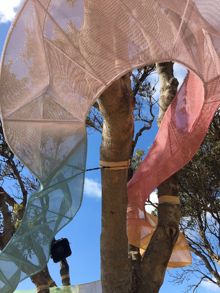 Diese Einschränkungen entschieden letztendlich über die verwendeten Materialien. Das Konzept verlagerte sich von einer naturnahen Umsetzung der Skulptur in ein stabiles Gebilde mit Edelstahlrahmen und Aluminiumgitter. Beides leichte Materialen, stark genug jedoch um den oft rauen Wind- und Wetterbedingungen für diesen Abschnitt der Küste standzuhalten. Simpson und Uchino beschlossen nun ihr Werk aus der Baumkrone herabhängend zu entwerfen, anstatt es aus dem Baum heraus wachsen zu lassen.