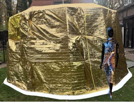 Actually I built up the „walk-in magical golden coffee capsule with capsule forest“. Base: Metall and wood construction 400x400x300cm/ Outside: original emergency blankets/ Inside: black fabric/ Art exhibition inside: 5 magically illuminated capsule trees, embedded in the scent of coffee, forest sounds and the quiet rustling of the capsules. It is an invitation to a festival of the senses, but also an invitation to reflect: could these shiny indestructible capsule trees BE the solution to our environmental problems, especially our forests, or...???