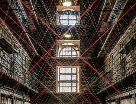 La sostanza della ramificazione del sapere, dell’intrecciarsi delle vite e della storia, viene scenograficamente condensato in 400 kg filo di maglieria colorata che, come un sensore elettronico, rivela l’invisibile.