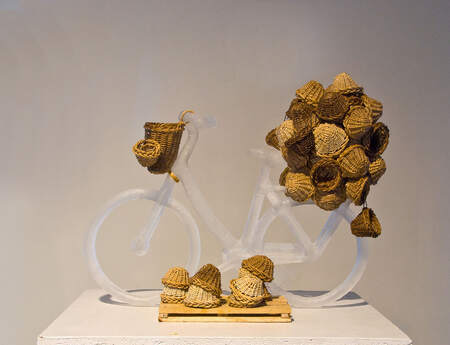These techniques are combined with blown glass, cast tin, textiles and wood.
