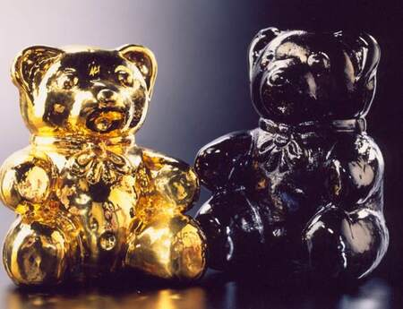 Teddy, in Form geblasen, Kristallglas, Farbglas