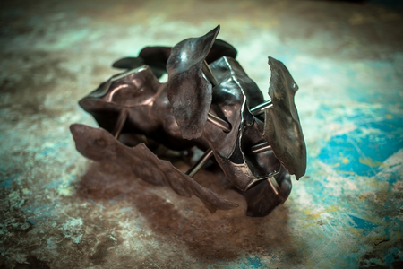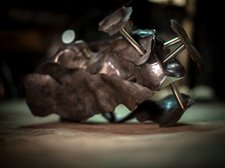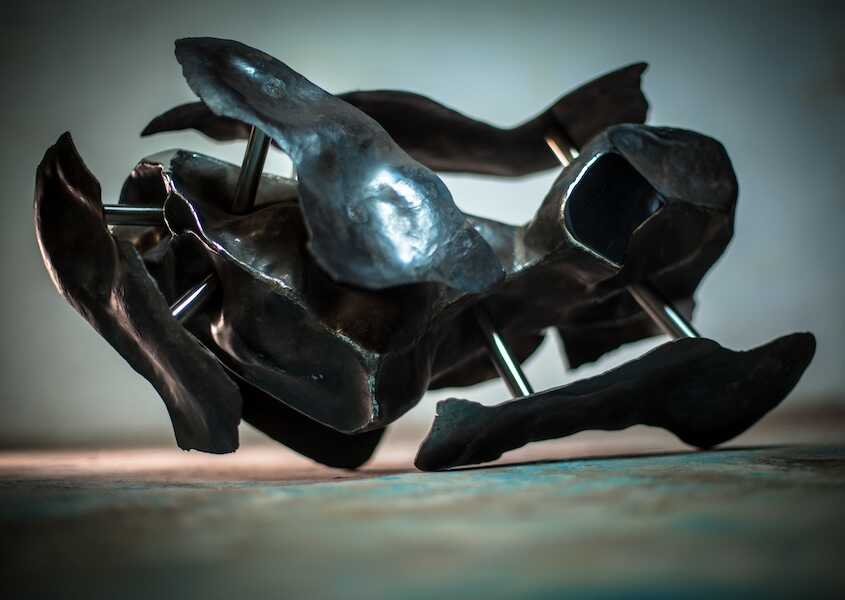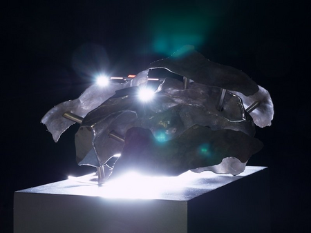 This work sensualises the two contrarious dualities in one – phague: devourer. Congestion, densification, introspection– but showing just a tendency to expand, too. Volume and its disolution, compactation vs. release and devolatilisation, motion through tension, space through omission, fracture vs. high polished beauty. With infinite options of sights & positions. So what is its condition? Where is the turning point, when inside turns outwards? Like inverting a sleeve...what will be left in the final stage? And my interest doesn't stop with completing the object, the completed work comes to existence again with its interelation with the environment