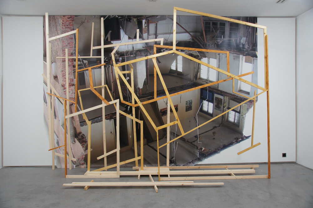 Installation of a wooden construction in front of a foto showing the inside of a house in destruction (Uninhabitable Objects, Bündner Kunstmuseum, Chur, Switzerland)