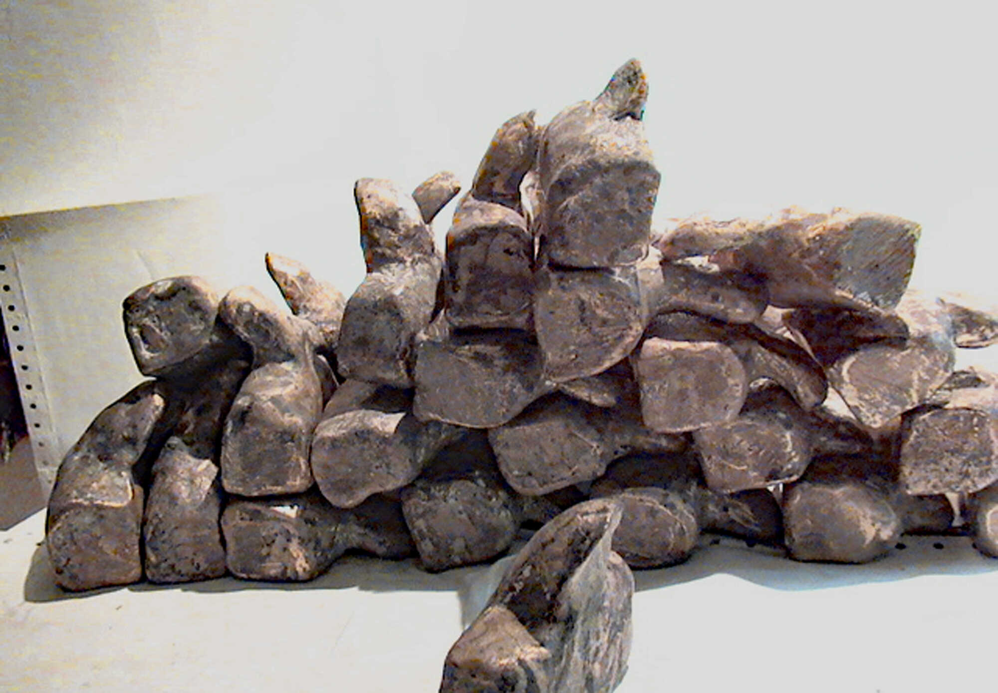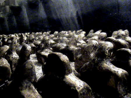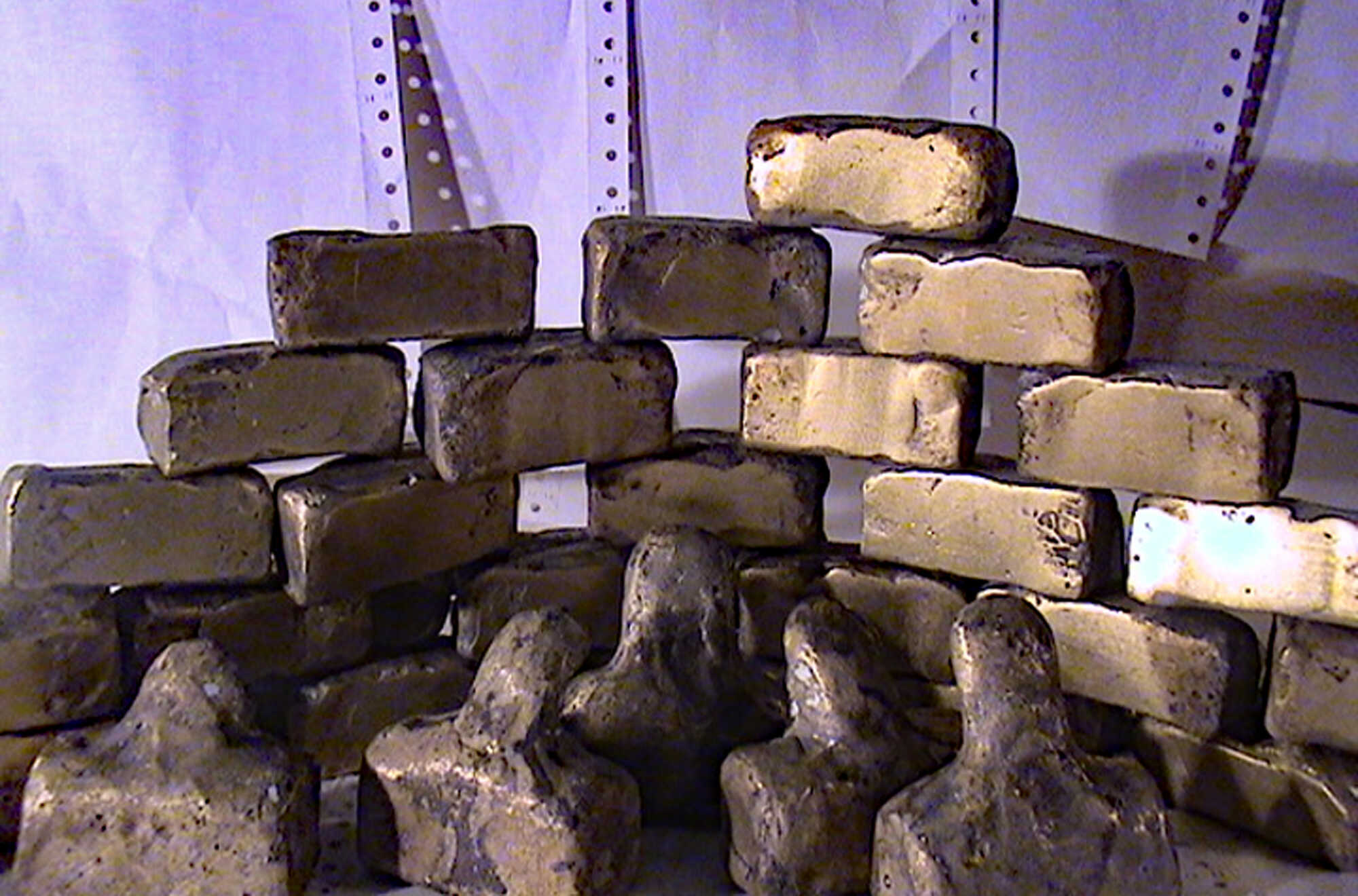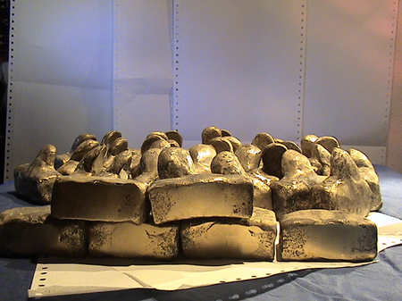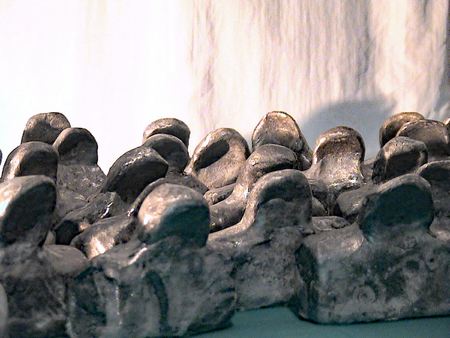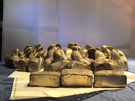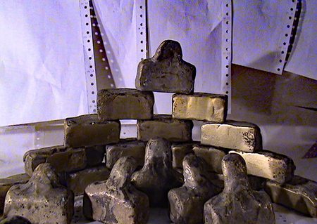 Bureaucrats, depicted as bronze busts, "stamp men." They exist individually, usually in groups, or en masse. Individuals become dead files and are thus ideally suited as material for career ladders, for establishing bureaucratic hierarchies, or for building walls that seal the bureaucracy off from its citizens. They are often seen as members of nodding conferences or commissions, which, following Parkinson's Law and Peter Principle, continually multiply.