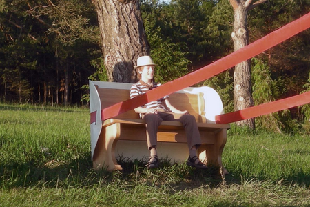 Site: former vineyard, now a leisure park overlooking the Danube valley. Placing one of the local public benches in front of a bended pine tree.