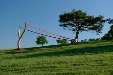 Here, on the vineyard stands her Schleudersitz. A romantic bench under a tree invites tired walkers to rest and contemplate the vast view. But the bench is stretched into a giant slingshot by a red rubber strap, ready to get shot right across the Danube Valley.