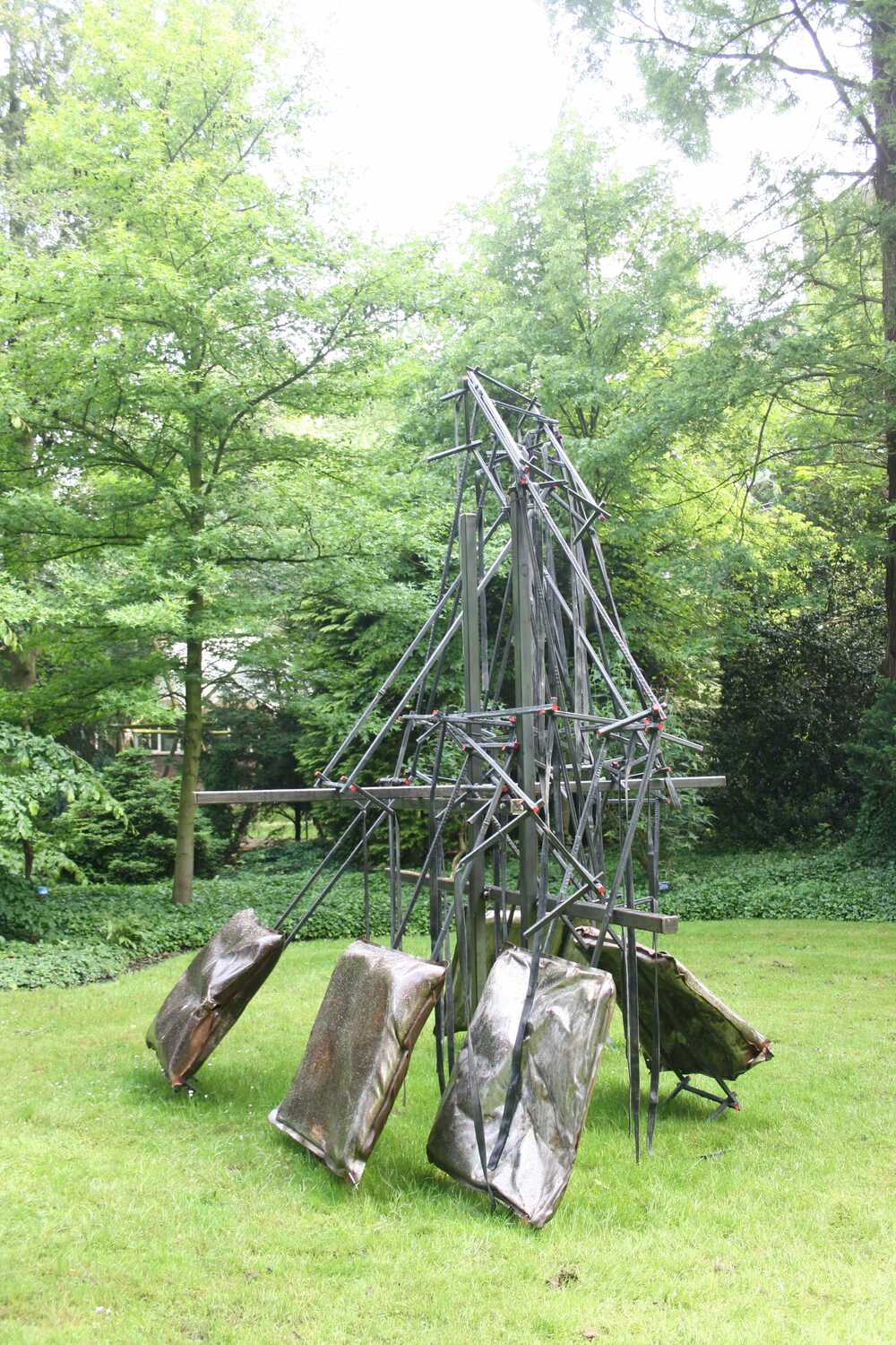 The Dutch landscape of horizontals and verticals has been pulled apart and reconnected. We see beds that cannot be slept on and iron pillows; a metaphor for a disoriented world. We have ended up in a nightmare. The different parts are connected in the way that Gerrit Rietveld used in his furniture, which looks fragile yet is sturdy.