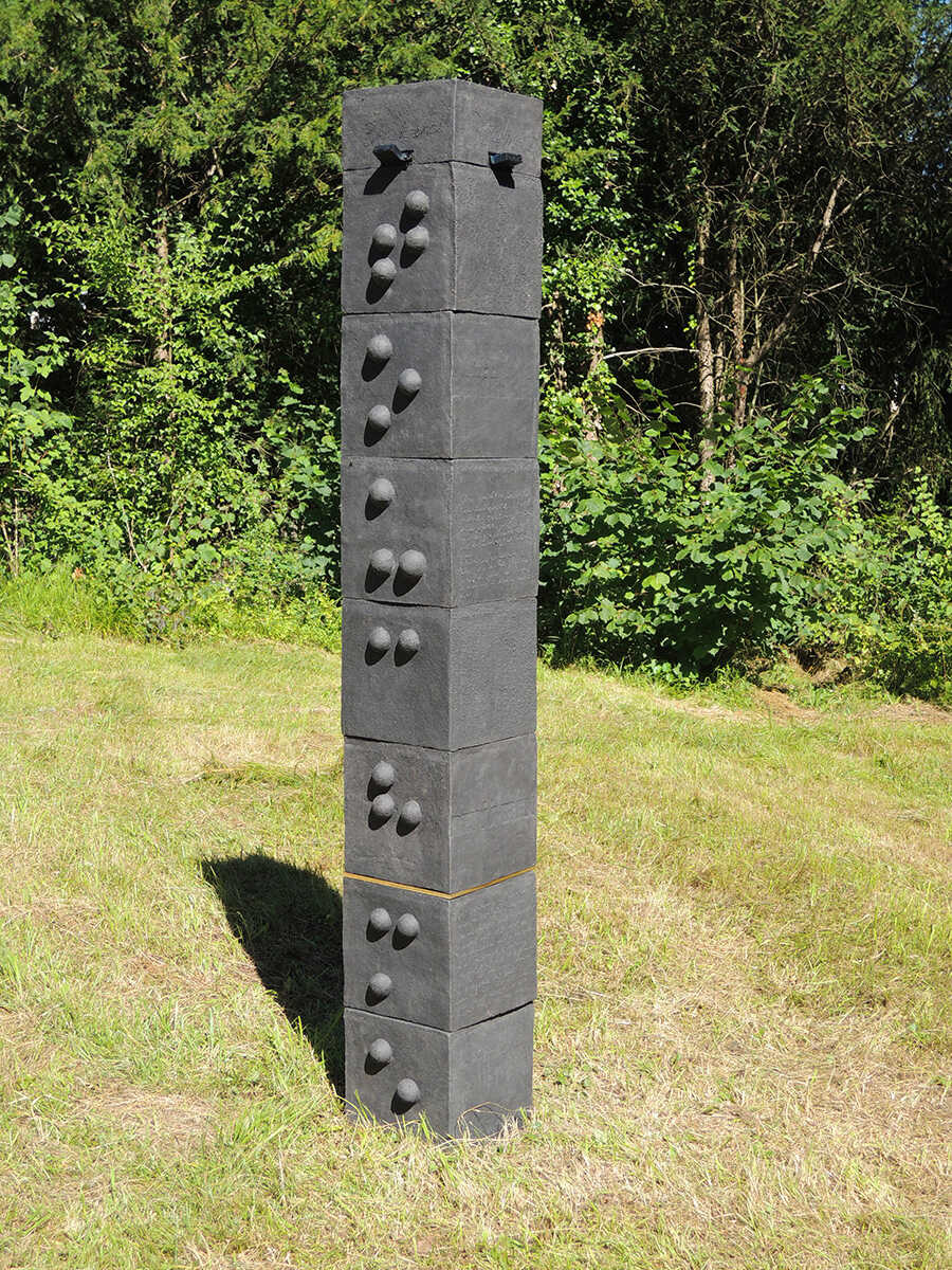 Mit ihrem Werk "Berührend" setzen sich Elisabeth Schneller und Donat Fritschy auf eine unmittelbare Art mit dem Ausstellungsthema "Kunst zum Anfassen" auseinander. Ausgehend von der Idee, ein Werk nicht nur für Sehende zu schaffen und dabei verschiedene Sinne anzusprechen, entstand eine Säule bestehend aus sieben Würfeln aus rauhem, stark schamottiertem schwarzem Ton, kombiniert mit einer intermedialen Installation.