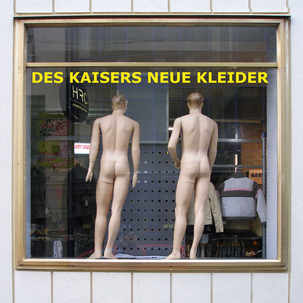 A text addition to a shop display in Dresden illustrates the novel "The emperor's new clothes".