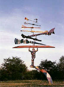 Notes: The client was the city of Berlin. The frequently visited park in this new part of the city (Prerower-Platz housing estate, approx. 100,000 inhabitants) prompted me to create a sculpture that is constantly changing due to the wind. Details to be discovered, such as peepholes in the body of the juggler = punker, and 7 different fantasy rotating elements offer ever new perspectives. The sculpture is maintenance-free thanks to encapsulated bearings floating in oil.