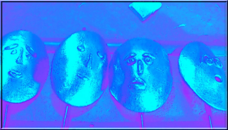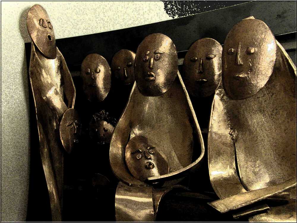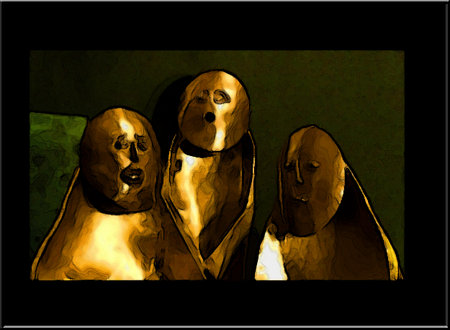 Die Bronzefiguren tragen Masken, die Besucher und Besucherinnen der Ausstellungen nach Wunsch austauschen können. Insgesamt 12 Bronze-Masken (10 x 7 x 4 cm groß) mit verschiedenen Merkmalen hängen an einer Eisentafel (45 x 55 cm), von der sie abgenommen und drei Bronzefiguren (insgesamt 50 x 40 x 30 cm) beigefügt werden können. Ein beliebtes Spiel auf Ausstellungen.