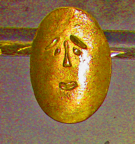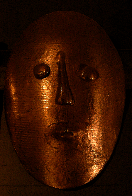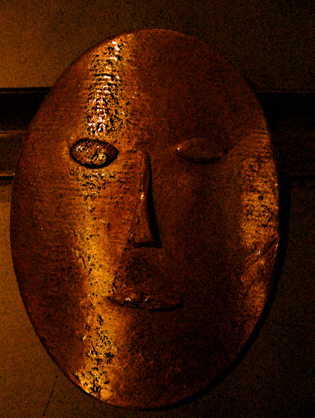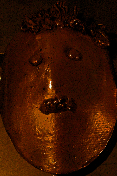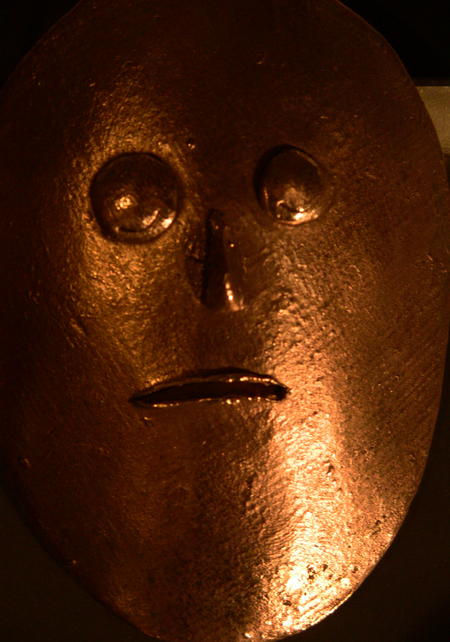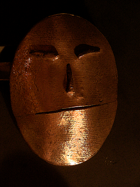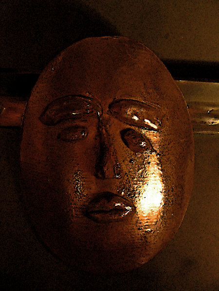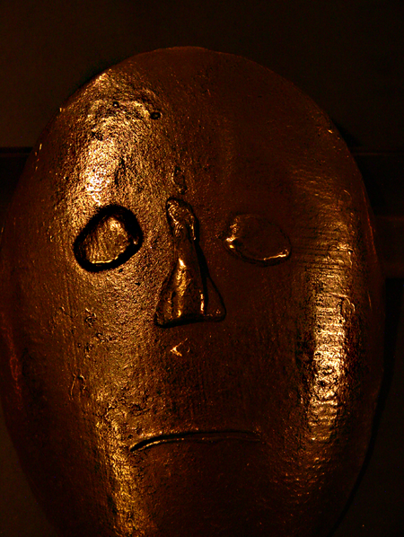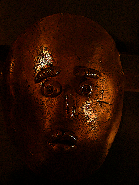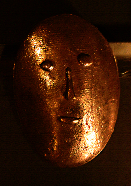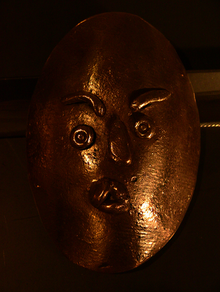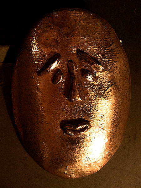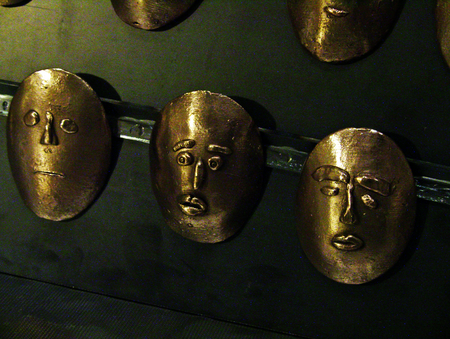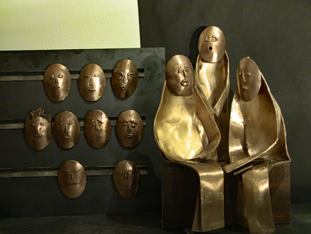 The bronze figures wear masks that visitors to the exhibition can swap out as they wish. A total of 12 bronze masks (10 x 7 x 4 cm in size) with different features hang from an iron panel (45 x 55 cm), from which they can be removed and attached to three bronze figures (totaling 50 x 40 x 30 cm). A popular game at exhibitions.