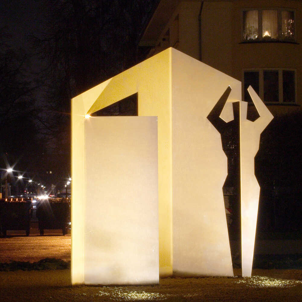 Die Skulptur will an die zahllosen Einzelschicksale und ihren oft tragischen Verlust von Heimat und Identität erinnern. Über die Hoffnung auf Offene Türen hinaus, ist das Recht auf Asyl in unserer Verfassung verankert.
