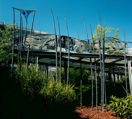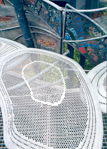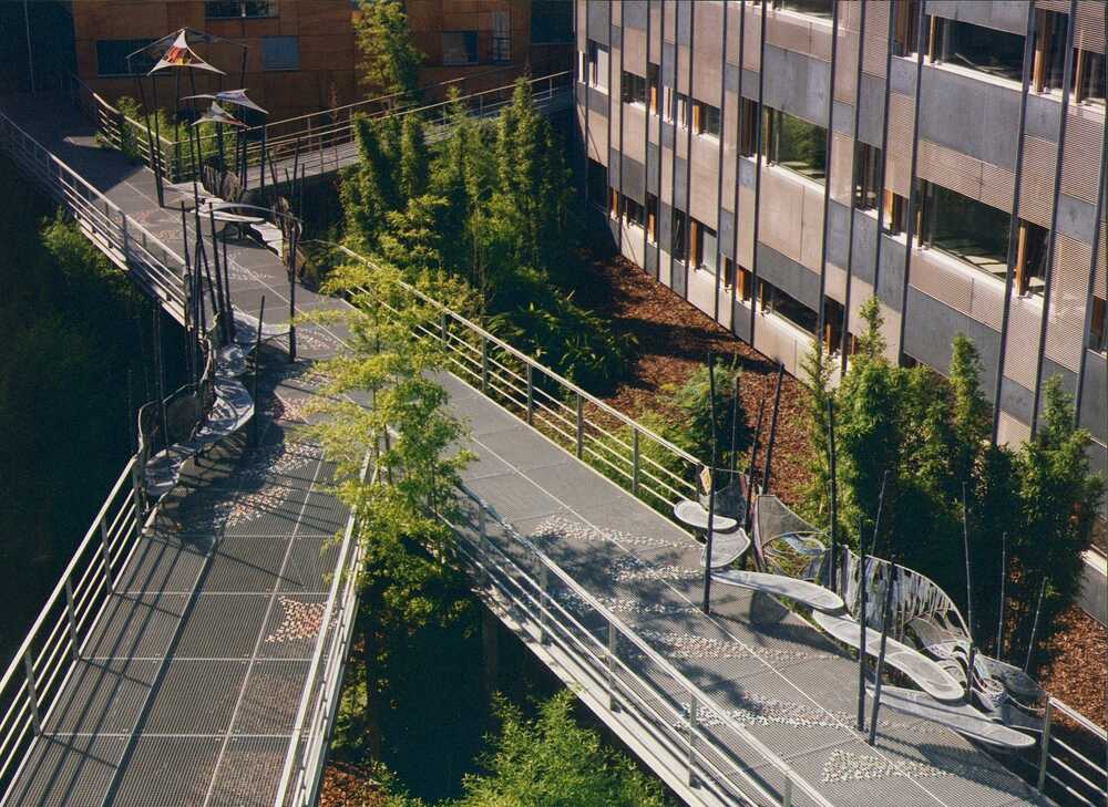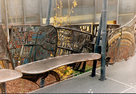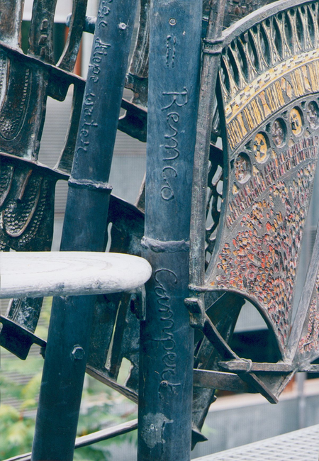 sittingelements in the jungle patio, university of Utrecht. The Poem "Lamento" made bij Remco Campert is written, in welded text, on the iron bamboos in the third part of benches, along the walking bridge. This poem is also made visable in the steel and bronze panels along the sides.