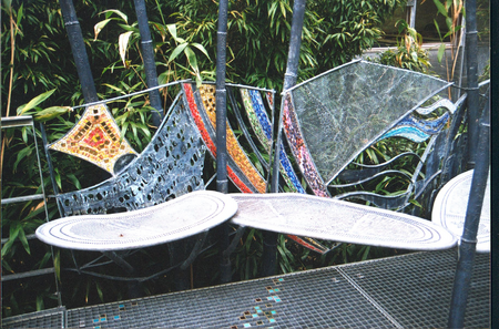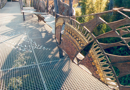 The shades of the little acrylic roofs is made of coloured mosaic in the grid of the bridge.