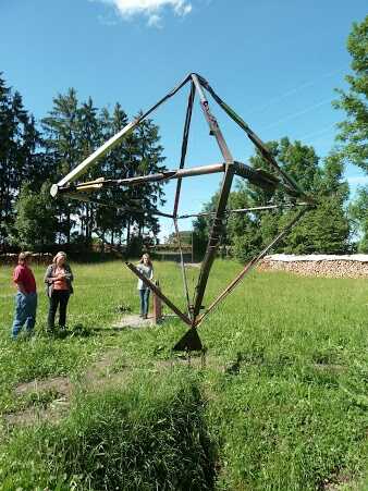 The work of art gives the viewer something to do: by lifting the octahedron out of the ground, the sculpture is set up in full size. A sublime moment in the life of a sculptor is made repeatable and tangible, even for the person turning the crank. But it also stands for: “Pulling the cart out of the mud.” The plumb line in the octahedron symbolizes: “to bring oneself into balance”, O for east and W for west is welded into the corners of the artwork, since N and S change when the sculpture is turned out. The side rods are from the prison's scrap metal collection and some parts from the artist's studio, e.g. parts of the bridge railing torn down as part of the renaturation of the Feuertobelbach, discarded agricultural equipment, a remnant of a spiral pipe forged by the artist, the handbrake of a burnt-out Mercedes Goldtimer, etc. The theme of the cube is taken up here as an open yet defined space with connections to life in society and its legally anchored FRAMEWORK CONDITIONS. The collaboration project with Mirko Siakkou-Flodin started on May 4, 2012 and involved 5 prisoners, 4 officers and the artist himself for a month, the welding work was carried out by the welding specialist and prisoner Tom, the three ID portraits in the black boxes were also created.