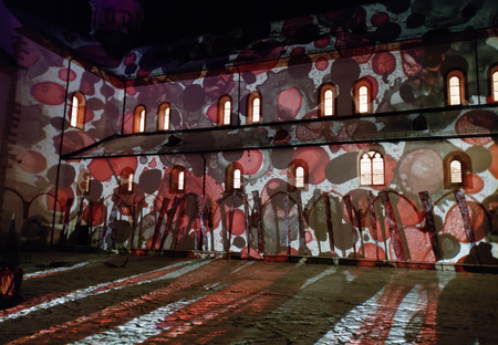 Projektionen bemalter Glasdias auf weiße Fahnen, "bewegte Leinwände" und Gebäude.http://wikuku.net/dekompresso.html