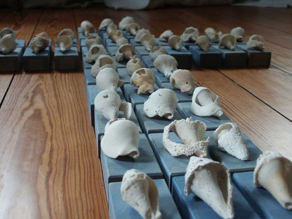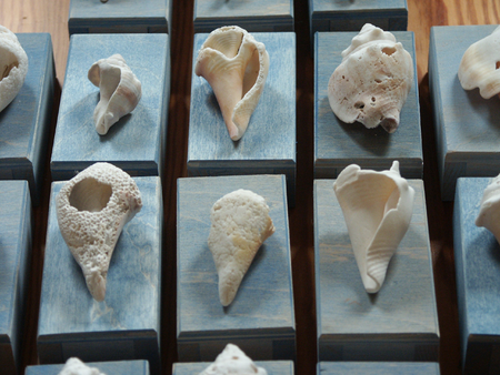 Muscheln mit Spuren der Zeit, Spuren des Verfalls, am Strand von Sanibel Island, Florida, gesammelt