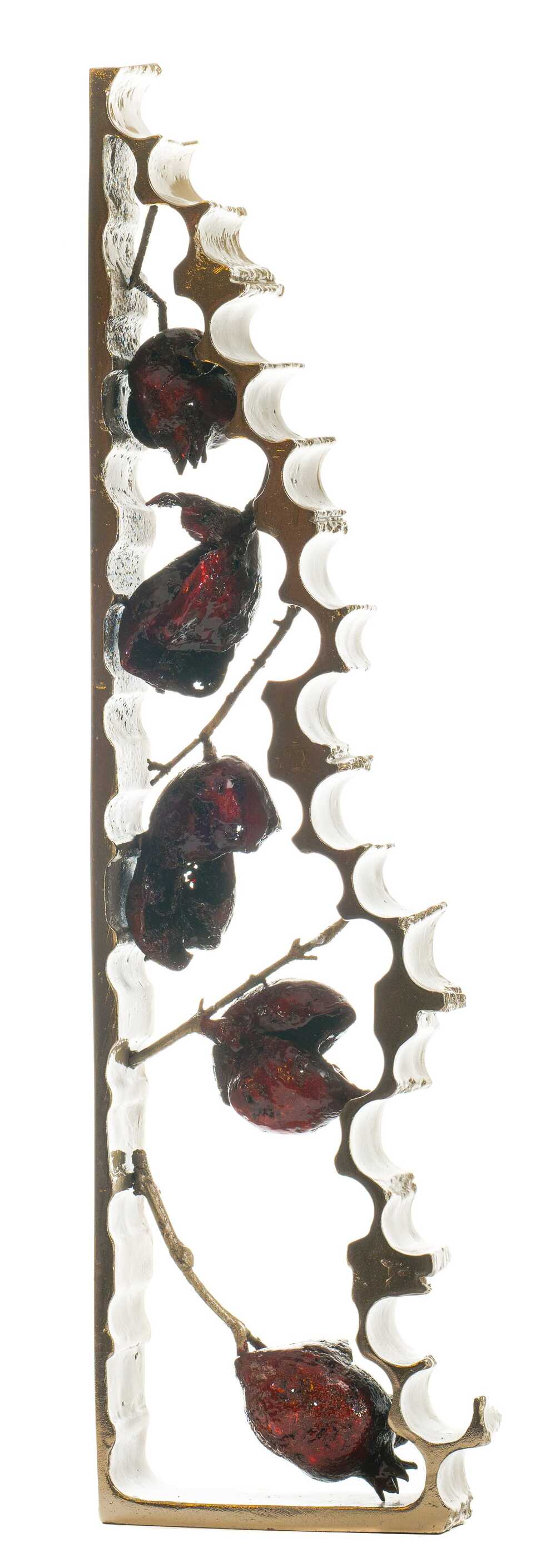 Open construction with 5 decomposing pomegranates. I pick up decomposing plant elements in order to capture the traces of passing time caused by wind, rain, soil or the human hand. I then incorporate them into my working process so that they lose their vulnerability and become durable. All decomposition halts.