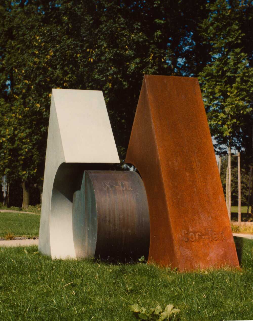 Das Innungszeichen habe ich als Skulptur umgesetzt, gefertigt aus den 3 Grundmetallen die in der Metallbearbeitung vorwiegend verwendet werden: Stahl (COR-TEN-Stahl), Kupfer und Aluminium