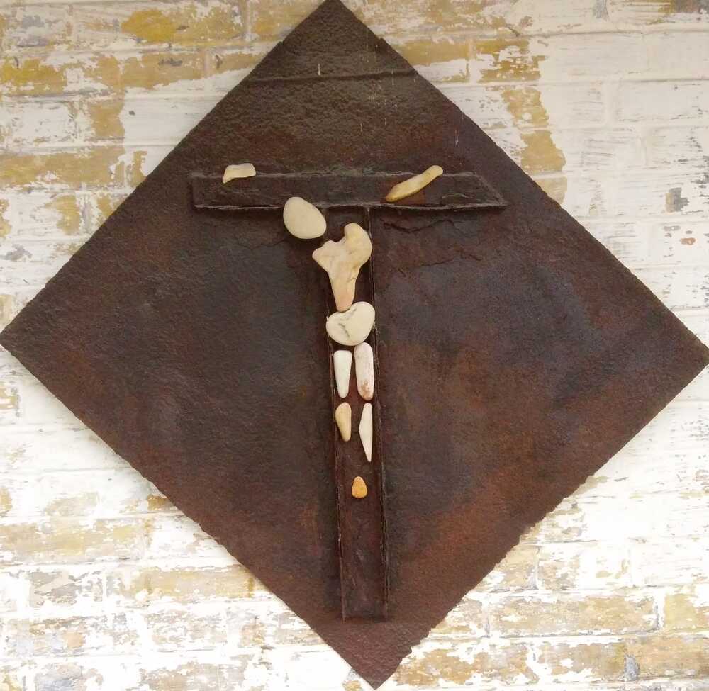 Ein alter verrosteter Kanaldeckel galt als Inspiration für dieses Werk. Mit gefundenen Steinen vom Meer ist dieser Gekreuzigte entstanden.