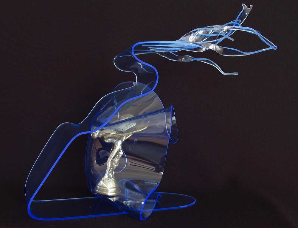 The inspiration for this work called “WIND” came from a little bronze figure, abandoned on the table of a garage sale. For this work “WIND” I used this bronze figure and nothing else but Plexiglas, which allows transparencies and attracts light, light that is present in nearly all my sculptures.