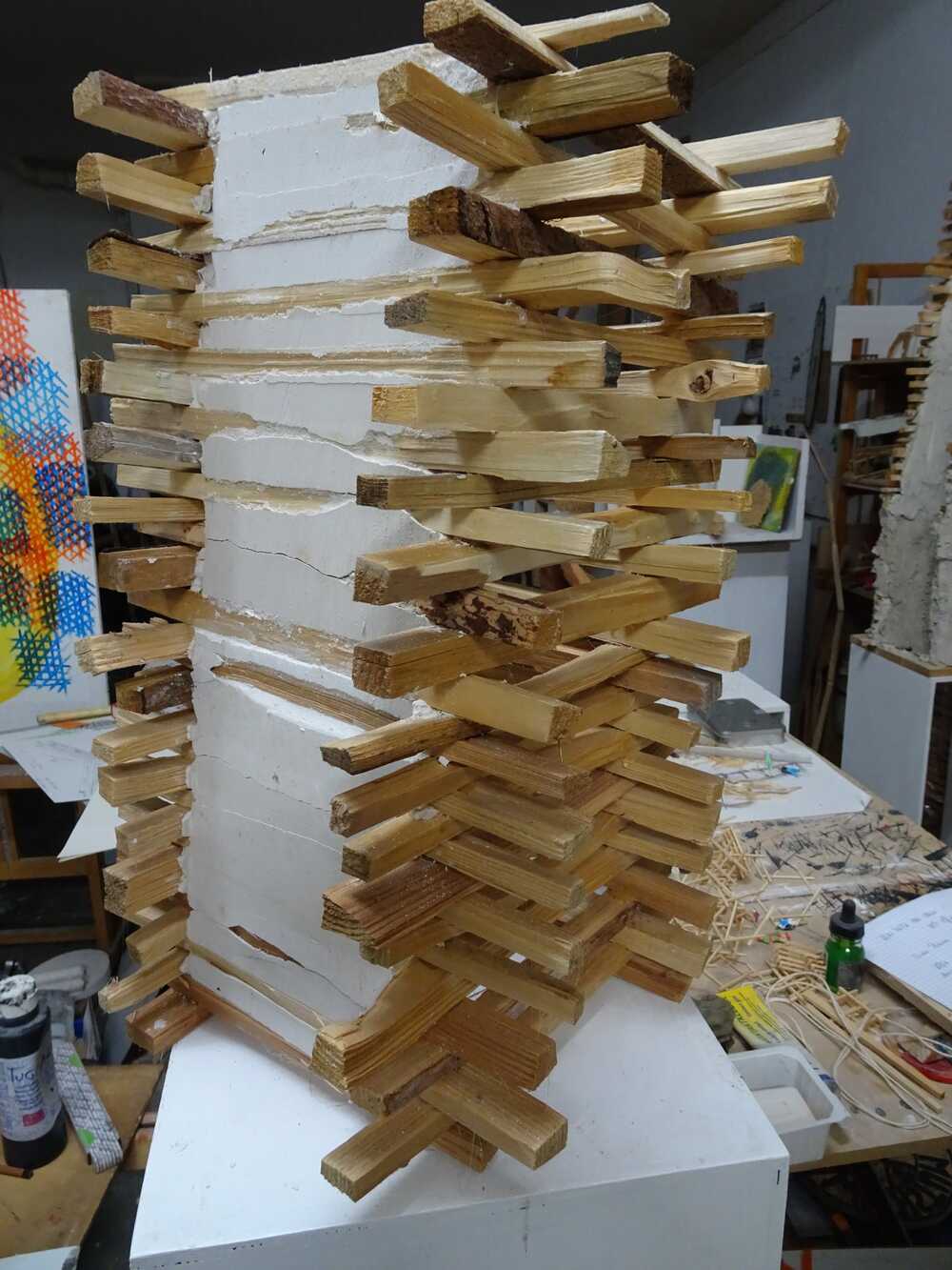 Holzscheite, gespalten, gestapelt, zwei Wände mit Gips. Innen eine Holz_Klang_Kompostion von Johannes Billich.