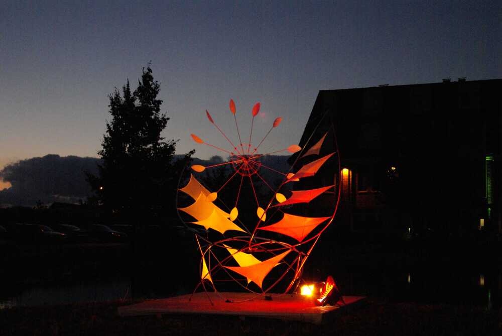kinetische beleuchtete Installation, Aluminiumstangen mit Stoff bespannt