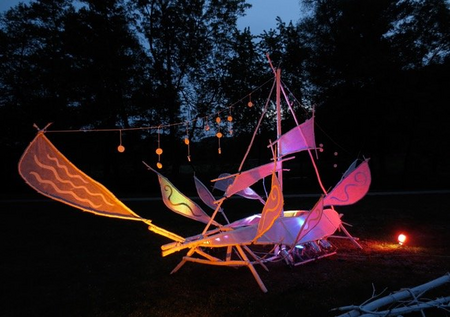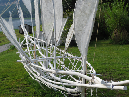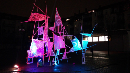 Astskulpturen aus Wildholz, Stoff, Farbe und Licht gefertigt - teilweise in Gemeinschaftsarbeit