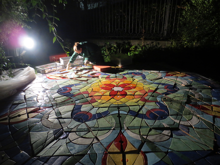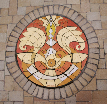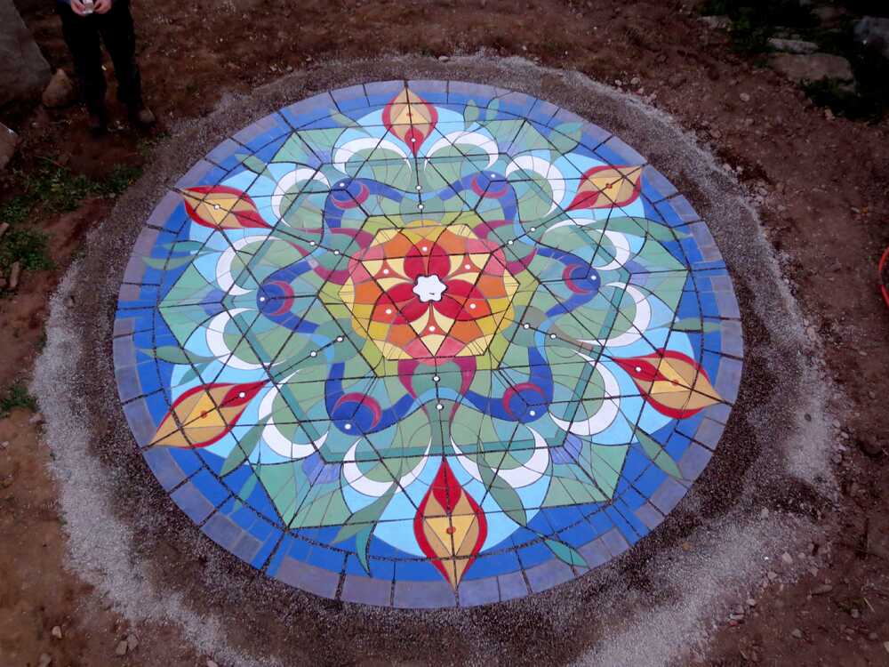 Die Maße beziehen sich auf das größte Bodenmosaik. Das kleines ist 40 x 40 cm, dazwischen verschiedene Größen. Alle Beispiele sind Auftragsarbeiten. In dieser Technik lassen sich dauerhaft große Platzgestaltungen, kombiniert mit Pflasterarbeiten realisieren.