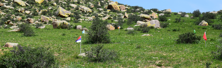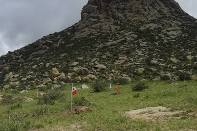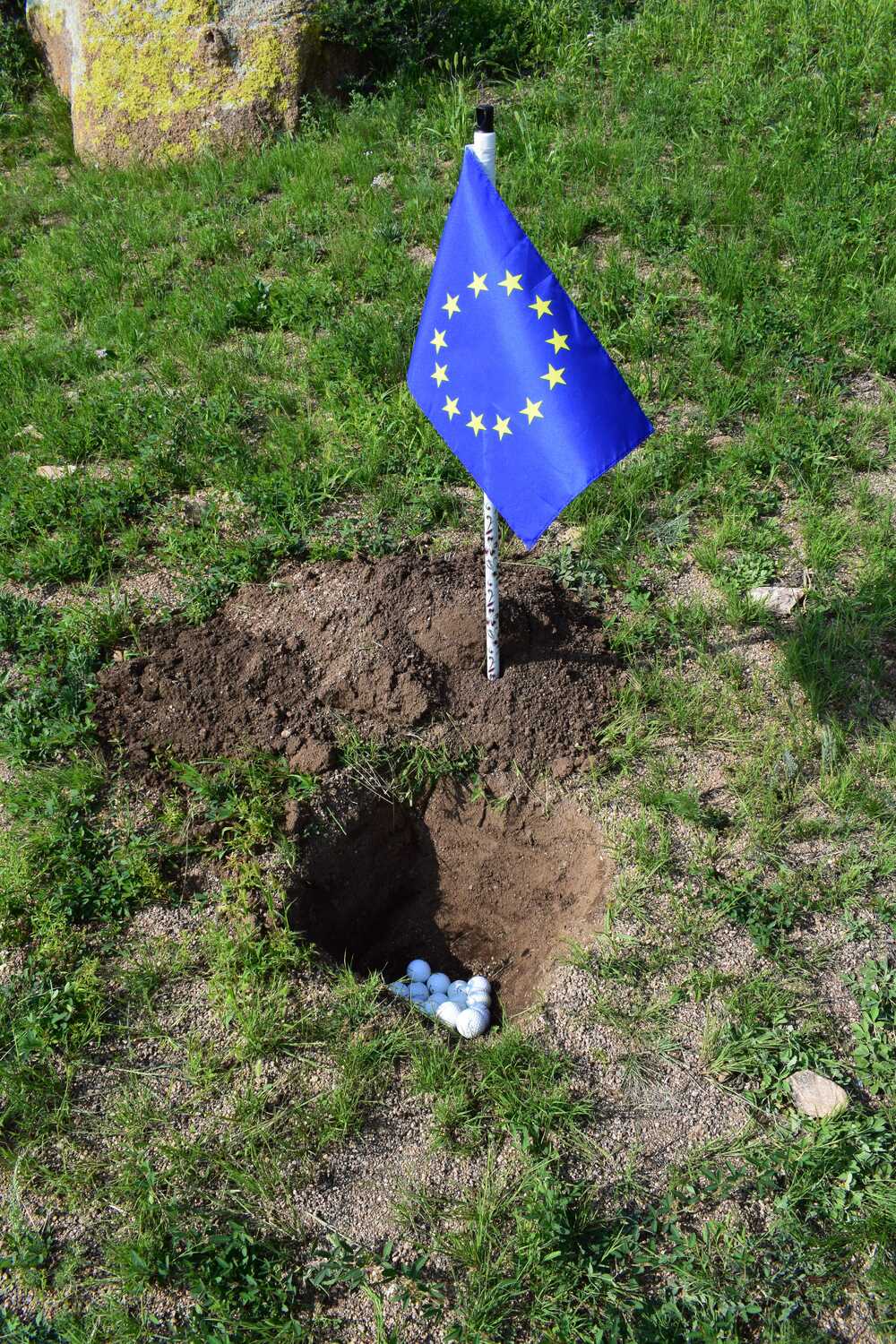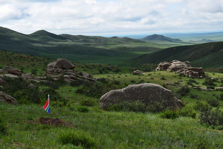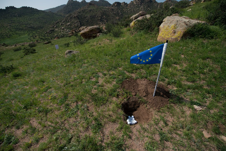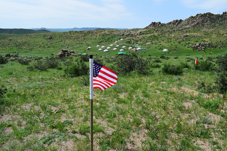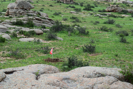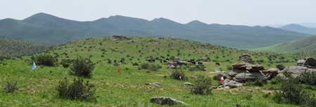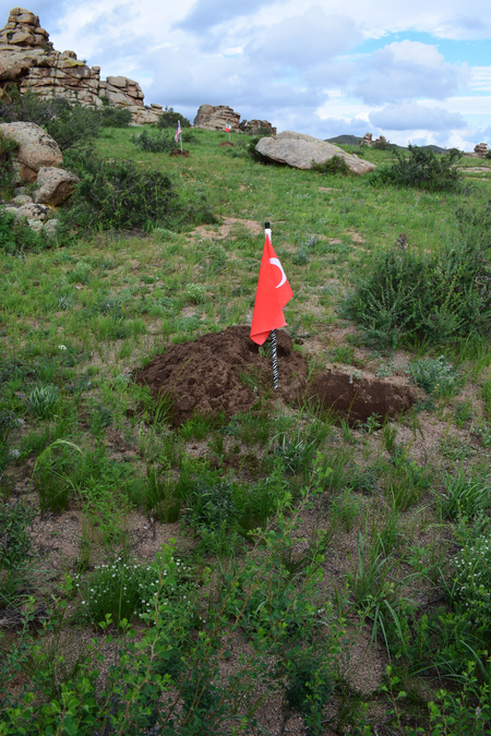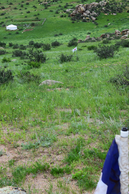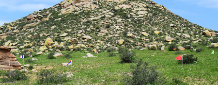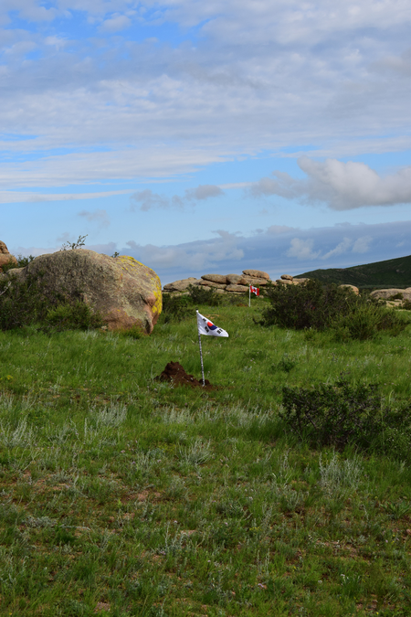 As an artist and architect focused on landscape, Michele Giacobino is concerned about the land, the ways in which humans use it, and in particular the question of which humans decide how the land is to be used. In this work for Land Art Mongolia 2018, the purely visual association between the green rolling grasslands of Mongolia and the game of golf is straightforward. But this artwork is not about golf as a sport, or about the enormous areas of land, and water resources, devoted to golf courses around the world. The title Club refers instead to the ‘club’ of G20 nations (20 of the nations with ‘developed’ or more powerful economies) whose attitudes largely determine the use of natural resources – including the land – around the world. So, in Club, the use of the flags of the twenty nations refers to he globalized culture of the G20. As Giacobino points out, the homogeneity of globalized culture leads people to seek out the unusual, ‘exotic’ or ‘undeveloped’, adjectives often applied to Mongolia. Since there are also artists from almost 20 nations (not G20) in this edition of Land Art Mongolia, come to experience the land and its people, Club can also be understood as a reflection on the artists and Biennial workshop. Flags are an ambiguous device, of course, referring not simply to the marker of the golfer’s ambition, but also to the territorial ambition and claims of nation states to possess the land. Giacobino’s artwork was present in the landscape for only a few days, and the artist was careful to return the soil to the places from which it had been displaced.