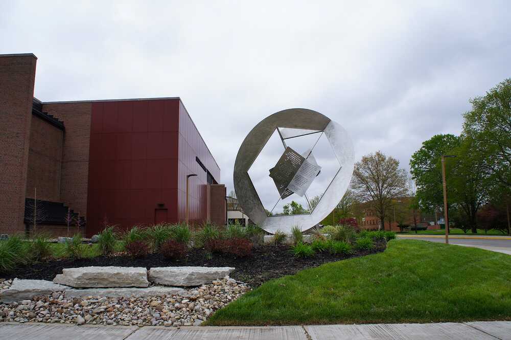 stainless steel, 10 ft. dia./3.3m.dia, OAC % art proj. installed at H.Q.B.Memorial Library, Central State Univ., Wilberforce, OH. theme of education, books, learning. 18 quotes by notable African American educators laser but into the central book pages.