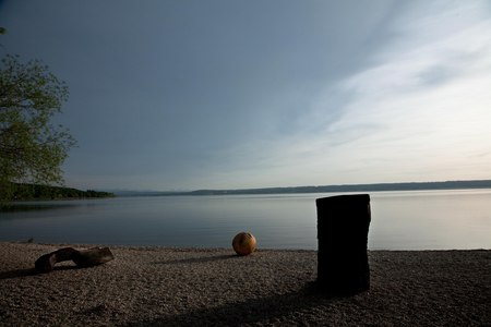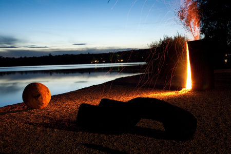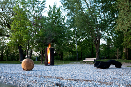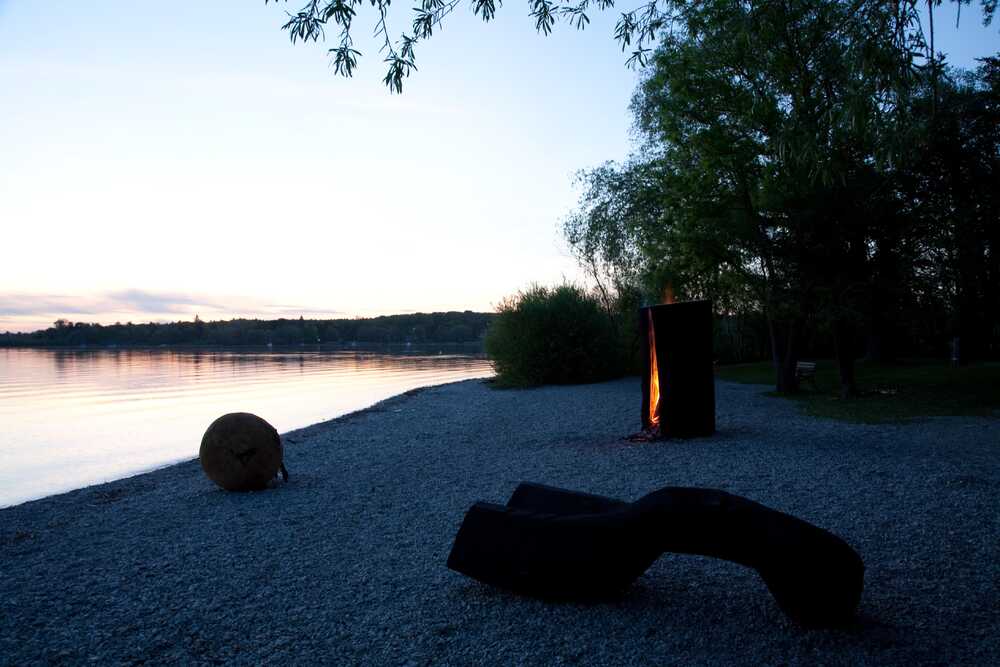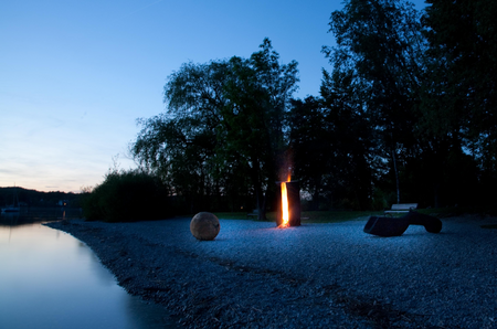 Skulpturengruppe (Ausstellungsansicht mit brennendem Stamm) am Ammersee,auf dem Kiesufer bei Herrsching