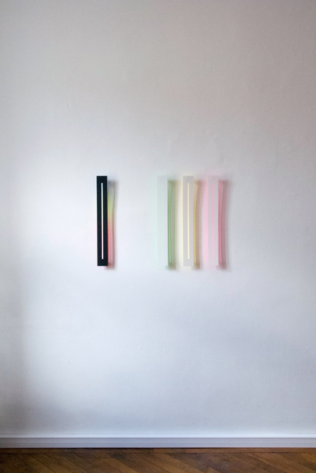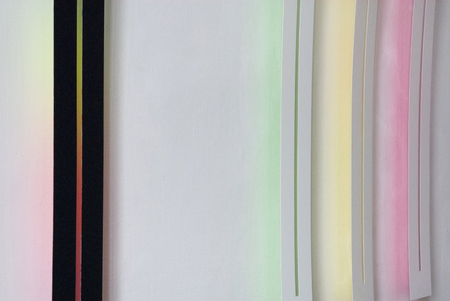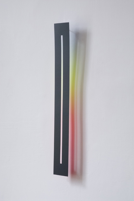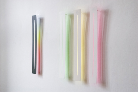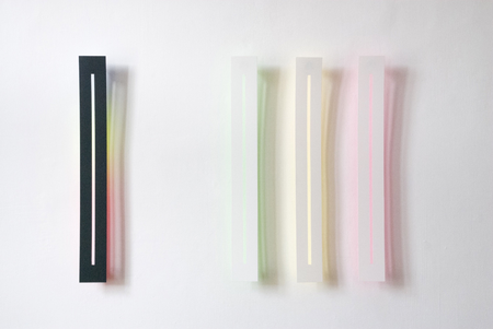 The wafer-thin strips hanging loosely on the wall and moving in the current of the air are pendent and emblematic of the fleetingness and immateriality of light.