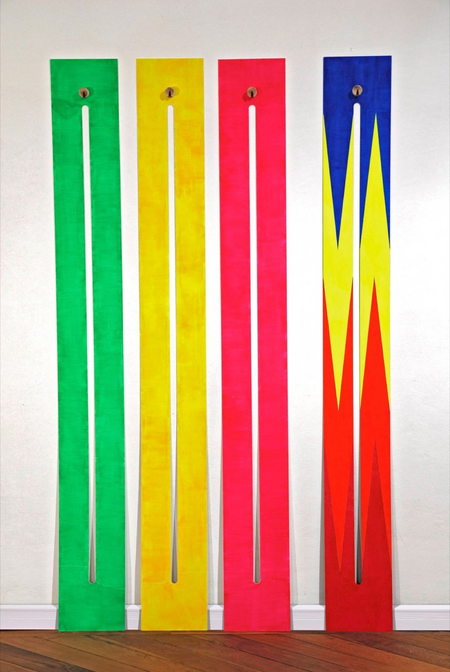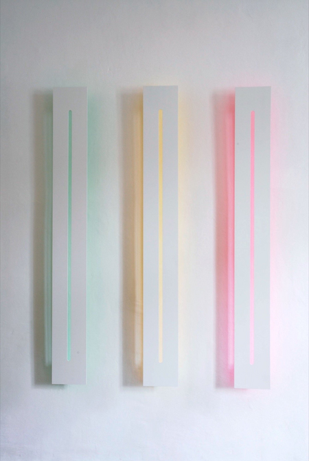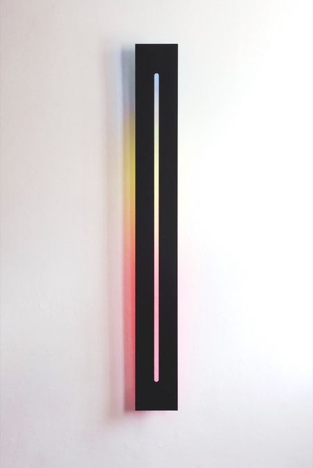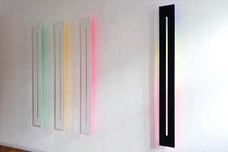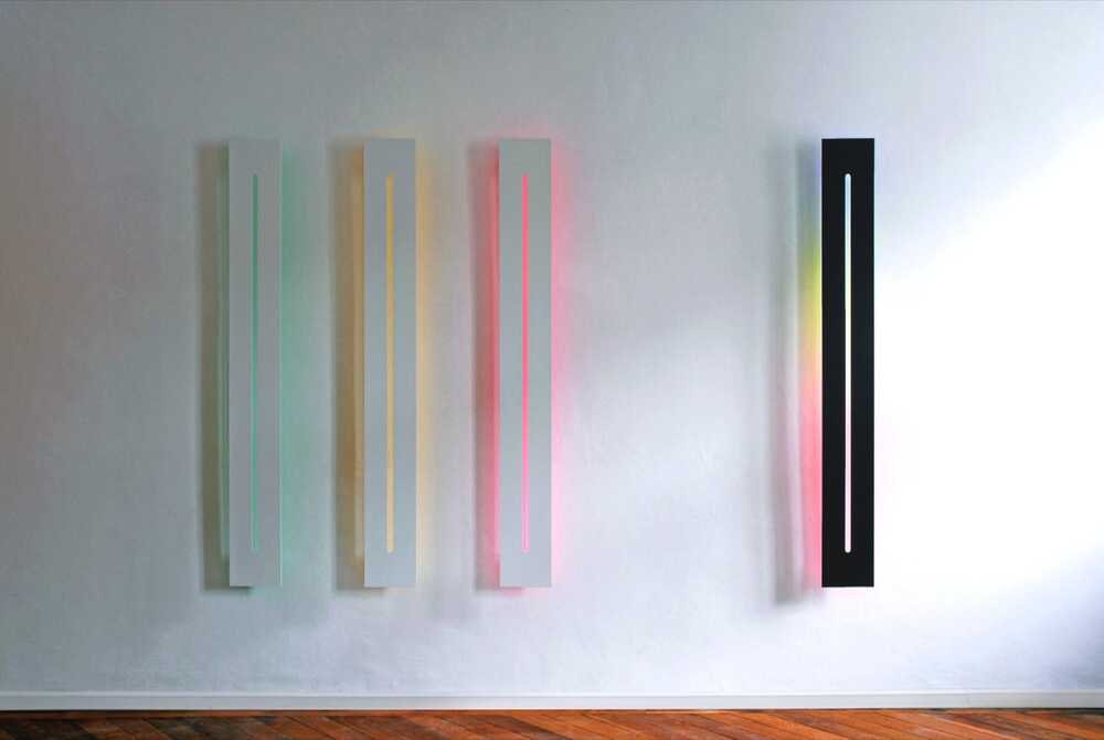 The wafer-thin strips hanging loosely on the wall and moving in the current of the air are pendent and emblematic of the fleetingness and immateriality of light.