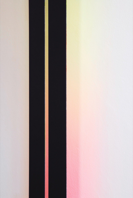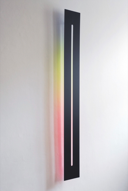 The strip has the primary colors painted on the back. Where they overlap, secondary colors emerge in the projection onto the wall. Together, they produce a color spectrum that is contained in daylight.