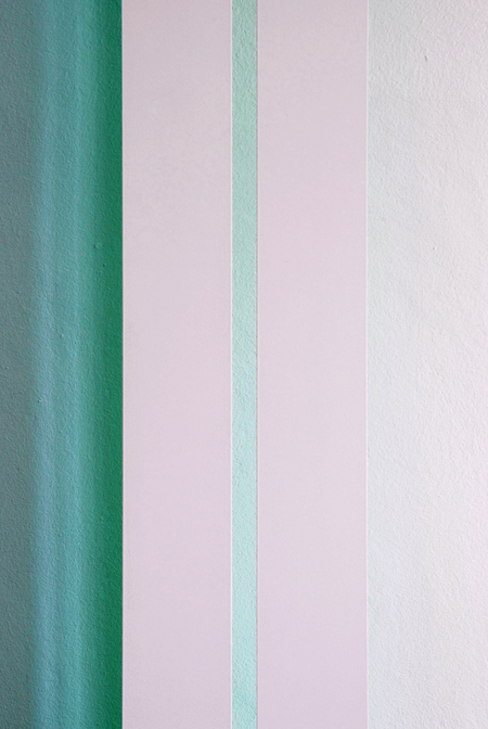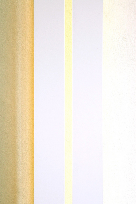 Its effect is astonishing: Since the eye has no spatial clue as light and shadow, the colored stripes paradoxically appear at the same time as painted and infinitely deep. One has the feeling that space is repealed.