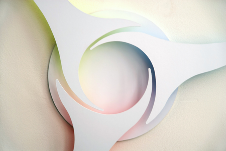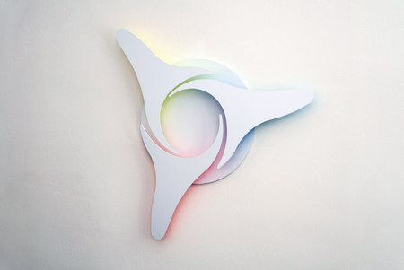 Like three spokes of a wheel or rays of a star, the three basic colors blue, yellow and red strive for a common dance on the round background disc. Outside the disc, each one by itself, they mix to a seemingly rotating color wheel.