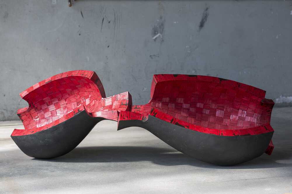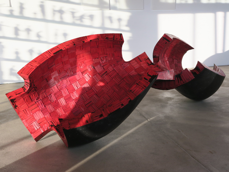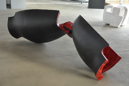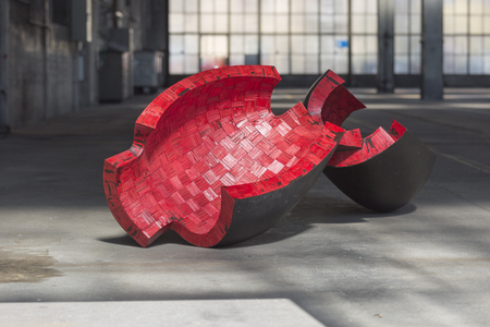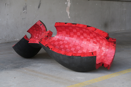 Like in acrobatic number of a vaudeville act: the actress – dressed red hot and provocative slinky; the actor – in black tailcoat; the antagonists flirt, prance and challenge – but also prop each other. The sculpture might resemble a hudge opened pomegranate and it bears its symbolics.