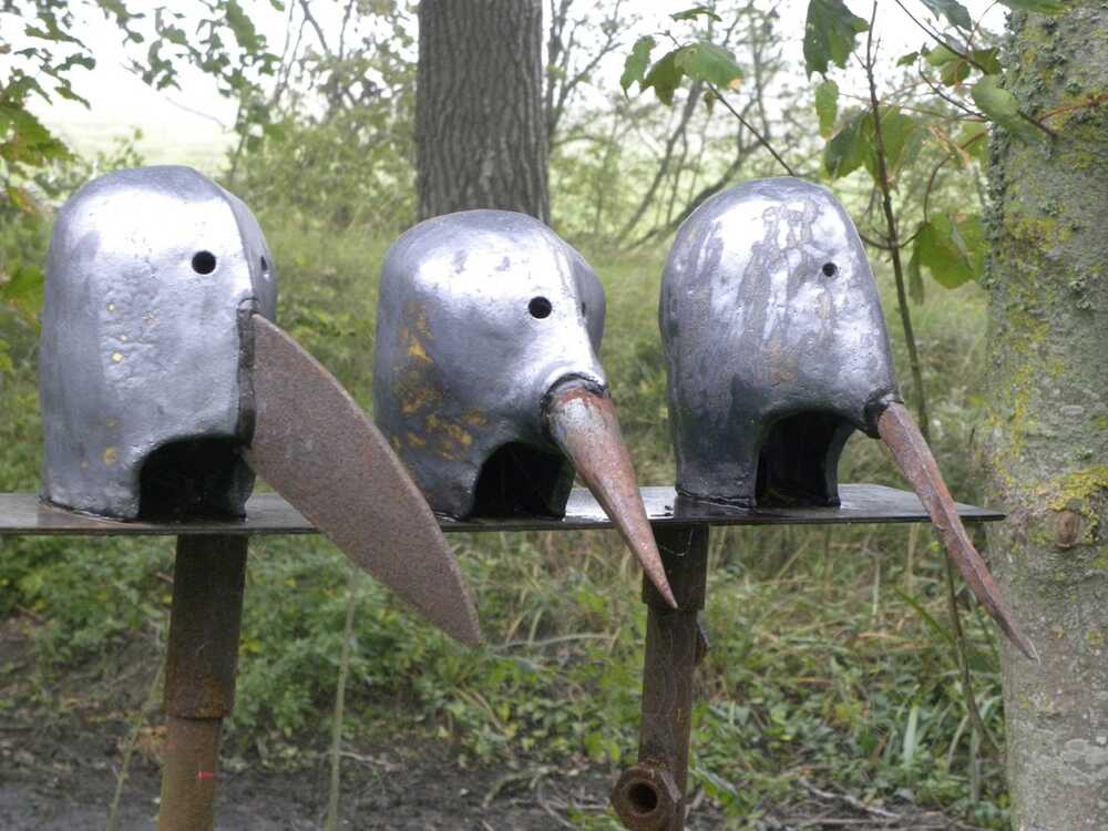 Drei Masken auf Eisenstativ,Keramik mit Redoxglasur, Fundeisen, Mixed Media, Schweiß- und Klebemontage,inspirierend waren Pestmasken!