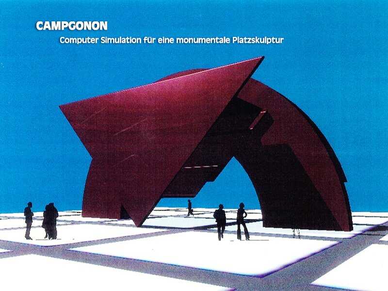 Starting out in 1993 it took seven years to complete the ever-evolving project called „CampGonon“. CampGonon, an amalgamation of fundamental symmetries, is to be realized as a monumental outdoor sculpture, which will be molted in a steel construction. Scaled to size according tot he site it will be devised for manufacturing. Possibly it requires production at a dockyard or hanger. A model of CampGonon, though, has already been turned into reality. Devised at my studio it was modelled out of platinized copper and brass measuring 1,80m in height, 3,50m in width and 1,10m in length.