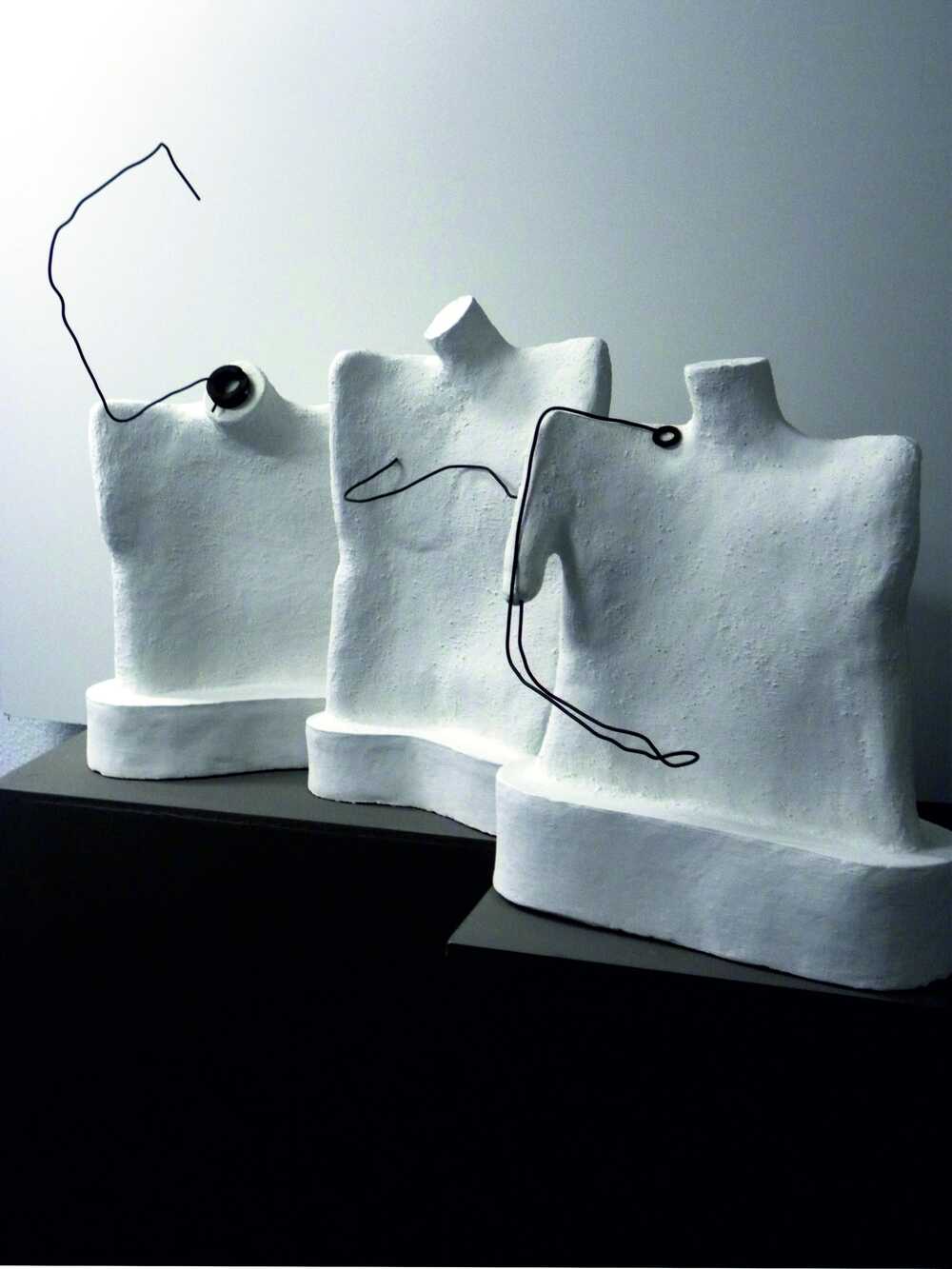 Dreiteilige Arbeit, Bildhauerton, weiße Engobe,Funddraht, Zufallsformen zum Thema eingesetzt, Klebemontage