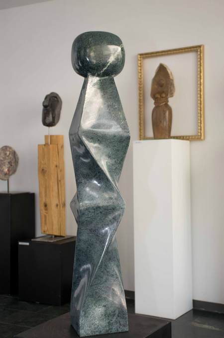 Aus einem Diabas-Block habe ich diese Stele herausgearbeitet. Mit Drall und Rückdrall bekommt sie eine ästhetische Form. Die Farbe von diesem Stein ändert sich je Lichteinfall von grau, grünlich bis bläulich.