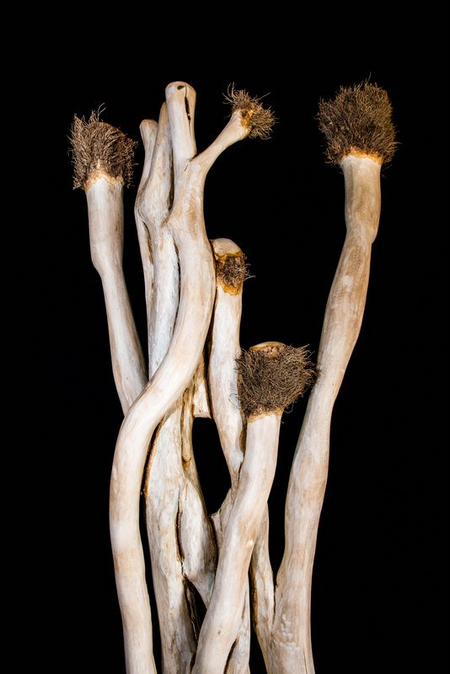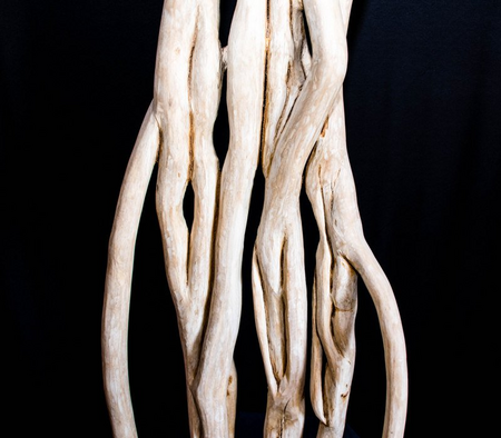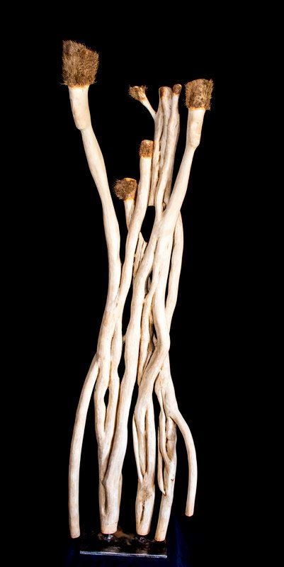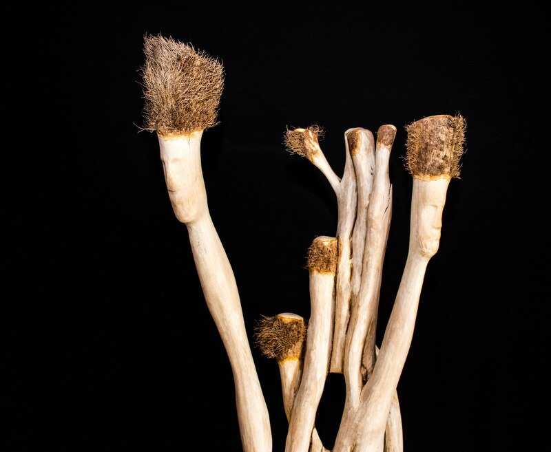 An einem riesigen Baum hochgeklettert ist dieser Efeu. Mit viel Liebe und viel Kleinarbeit von der Rinde gelöst und bearbeitet ist diese zusammengewachsene Gruppe mit Gesichtern und Hüten entstanden - mit Bildhauer-Eisen bearbeitet, geraspelt, geschliffen, gewachst, poliert,
