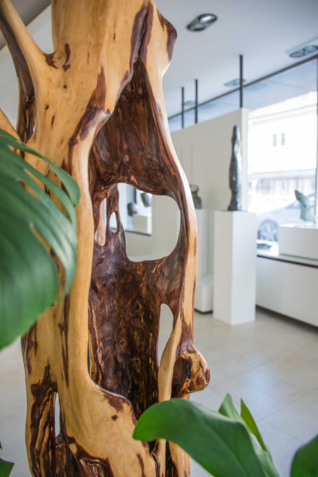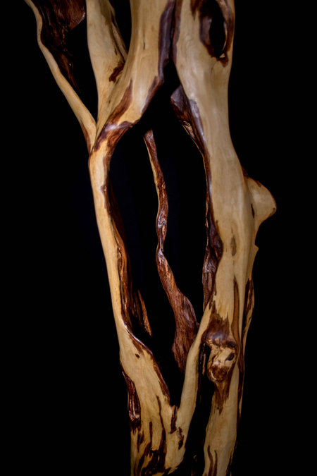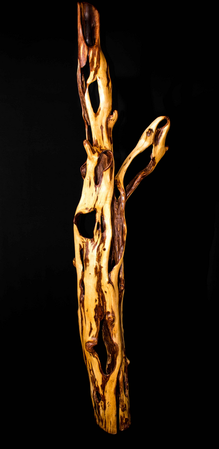 Gesägt, mit Bildhauer-Eisen viel ausgehöhlt und bearbeitet, geraspelt, viel geschliffen, gewachst, poliert,