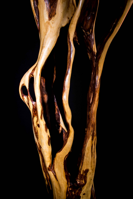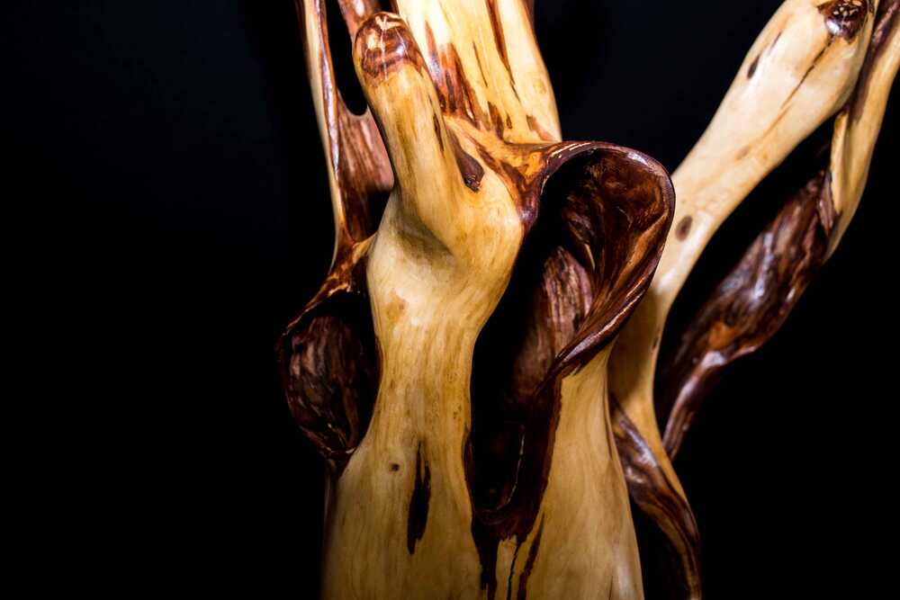 Ein ganz besonderes und spezielles Holz ist die Blutpflaume. Als ich den halb verfaulten Stamm bekommen habe, wusste ich noch nicht, was für ein Schatz darin verborgen war. Nachdem ich die faulen Stellen großzügig entfernt hatte, kam innen ein sehr hartes, dunkles Holz zum Vorschein und außen war das Holz fast leuchtend hell. Dieser Kontrast fasziniert mich heute noch.